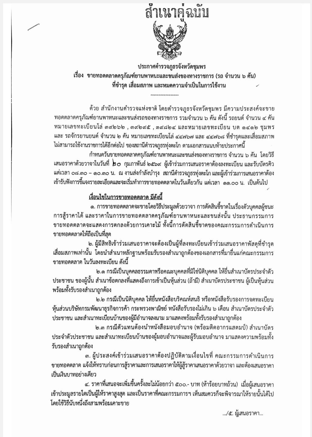 ตำรวจภูธรจังหวัดชุมพร มีความประสงค์จะขายทอดตลาดครุภัณฑ์ยานพาหนะและขนส่งของทางราชการ รถยนต์ จำนวน 4 คัน , รถจักรยานยนต์ จำนวน 2คัน ของ สถานีตำรวจภูธรทุ่งตะโก ตามเอกสารแนบท้ายประกาศนี้