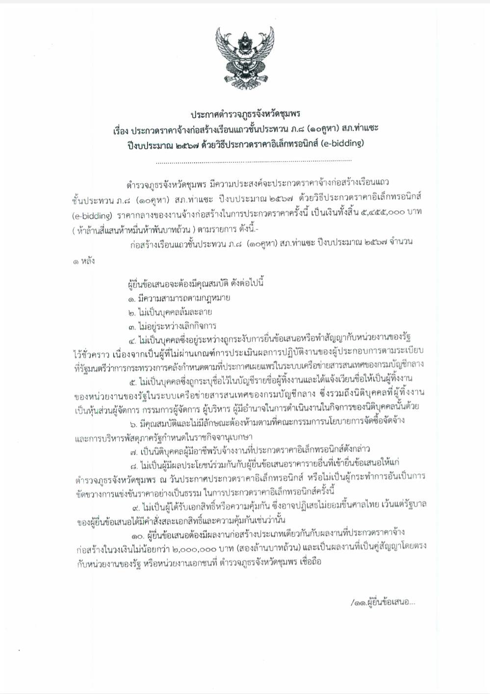ตำรวจภูธรจังหวัดชุมพร มีความประสงค์จะประกวดราคาจ้างก่อสร้างเรือนแถวชั้นประทวน สภ.ท่าแซะปีงบประมาณ 2567 ด้วยวิธีประกวดราคาอิเล็กทรอนิกส์ (e-bidding)
