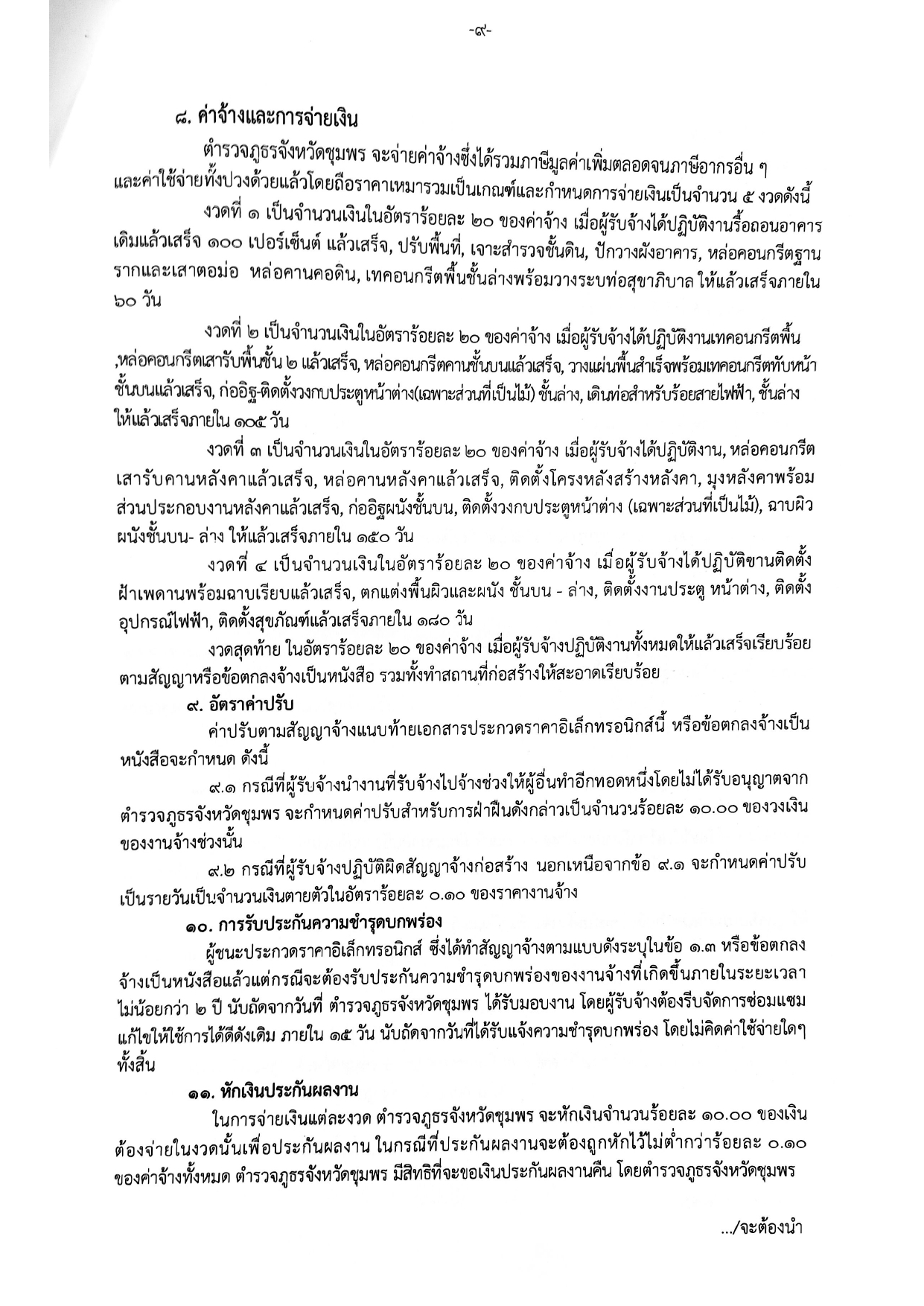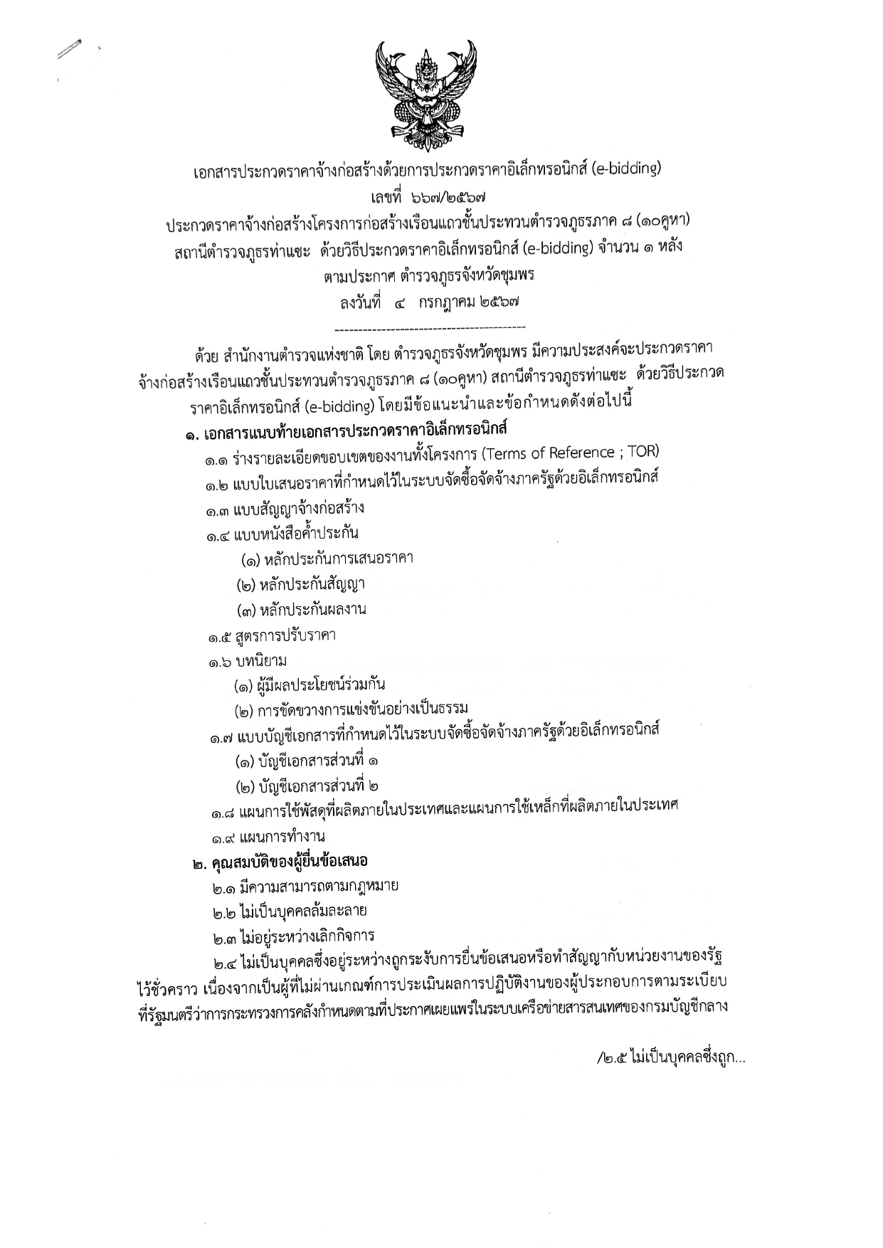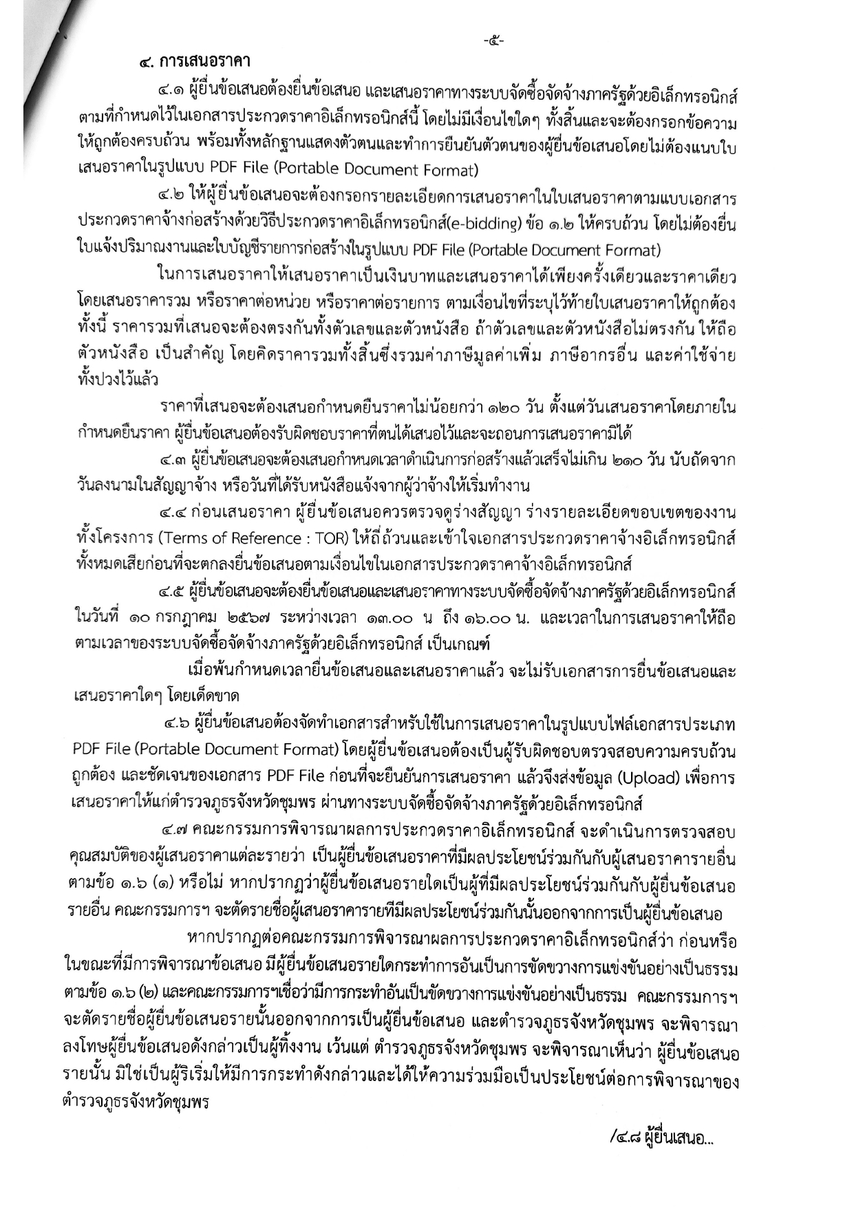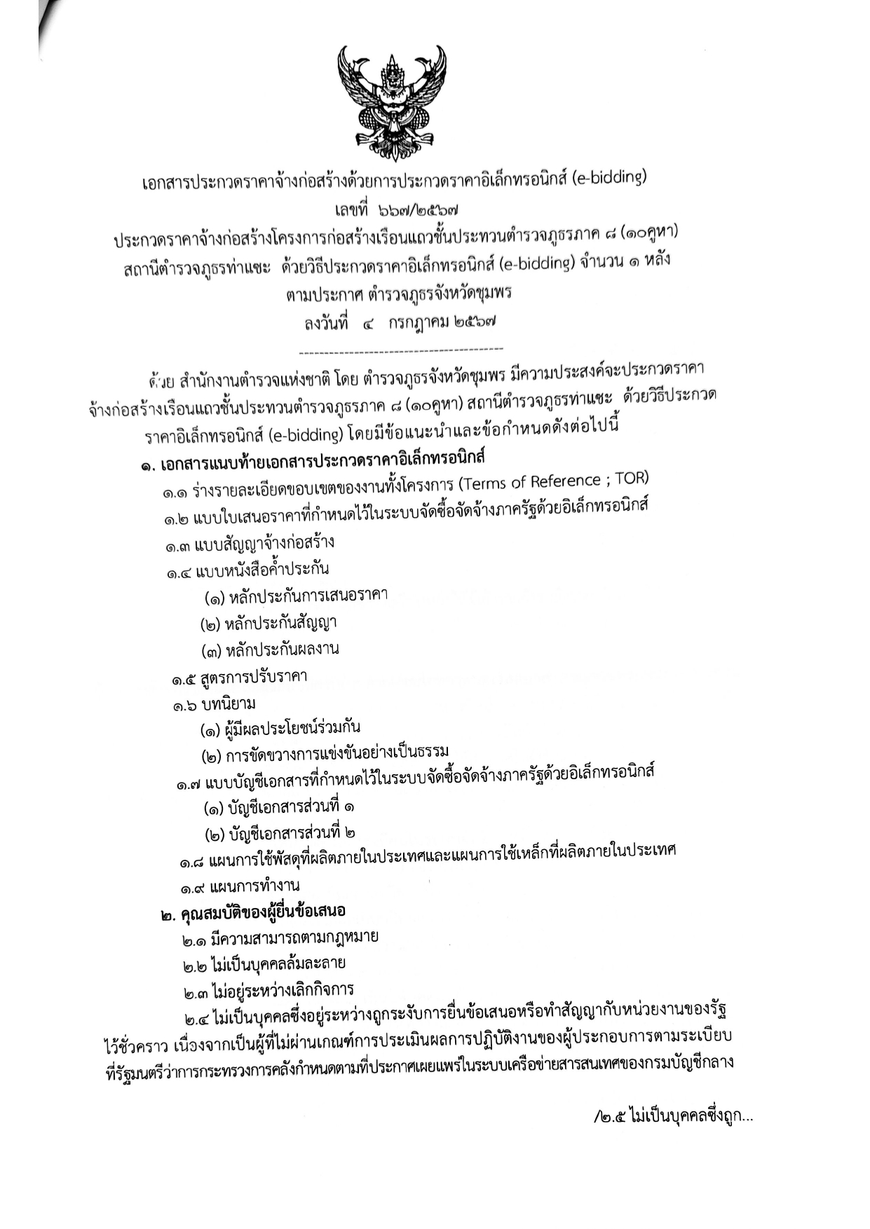 ตำรวจภูธรจังหวัดชุมพร มีความประสงค์จะประกวดราคาจ้างก่อสร้างเรือนแถวชั้นประทวน สภ.ท่าแซะ ด้วยวิธีประกวดราคาทางอิเล็กทรอนิกส์ (e-bidding) รายละเอียดตามเอกสาร
