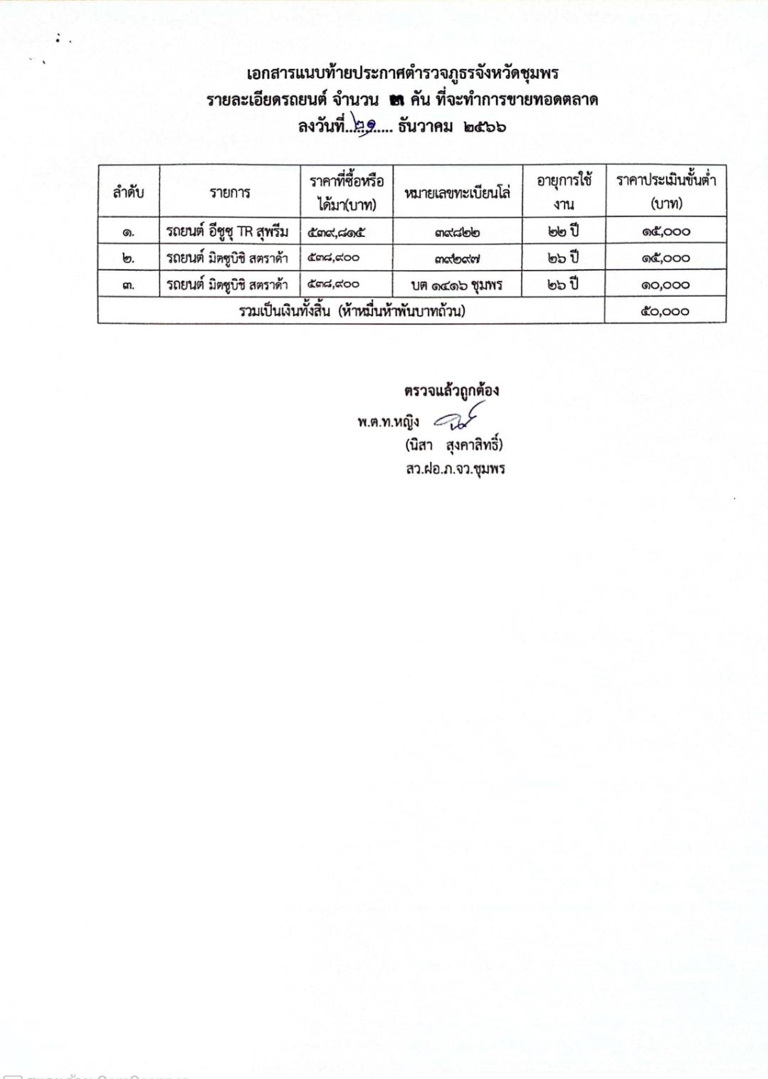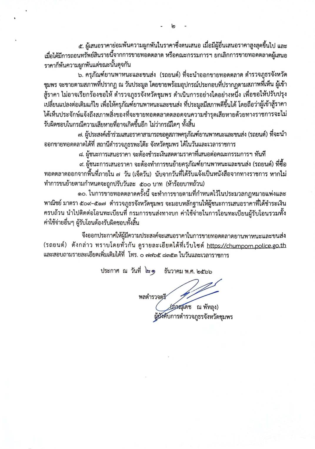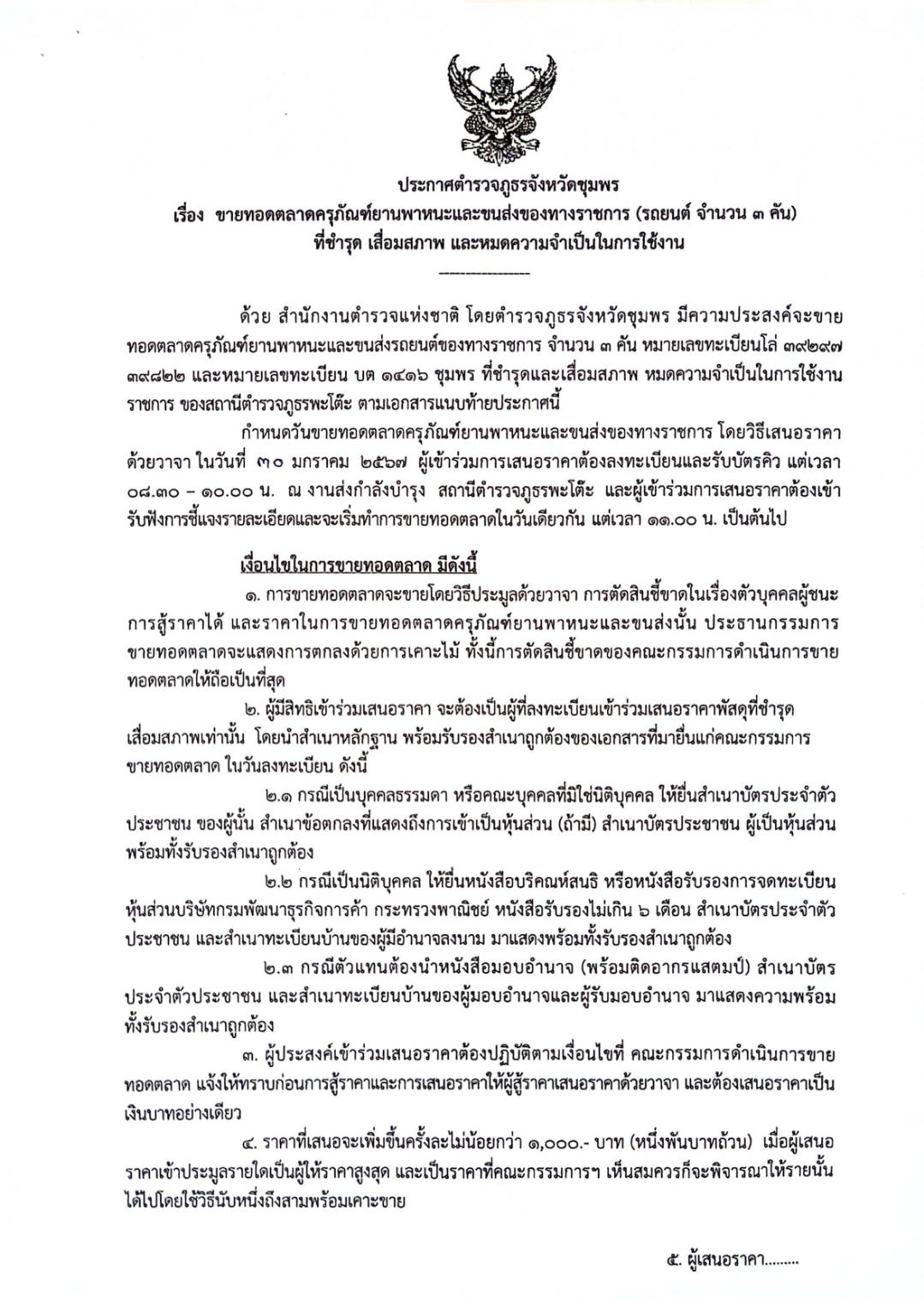 ประกาศขายทอดตลาดครุภัณฑ์ยานพาหนะรถยนต์ 28 ธันวาคม 2566 by admin / ข่าว ภ.จว.ชุมพร,ข่าวประชาสัมพันธ์,ข่าวประชาสัมพันธ์,ข่าวฝากประชาสัมพันธ์,ข่าว ภ.จว.ชุมพร,งานส่งกำลังบำรุง ตำรวจภูธรจังหวัดชุมพร มีความประสงค์จะขายทอดตลาดครุภัณฑ์ยานพาหนะและขนส่งของทางราชการ (รถยนต์)