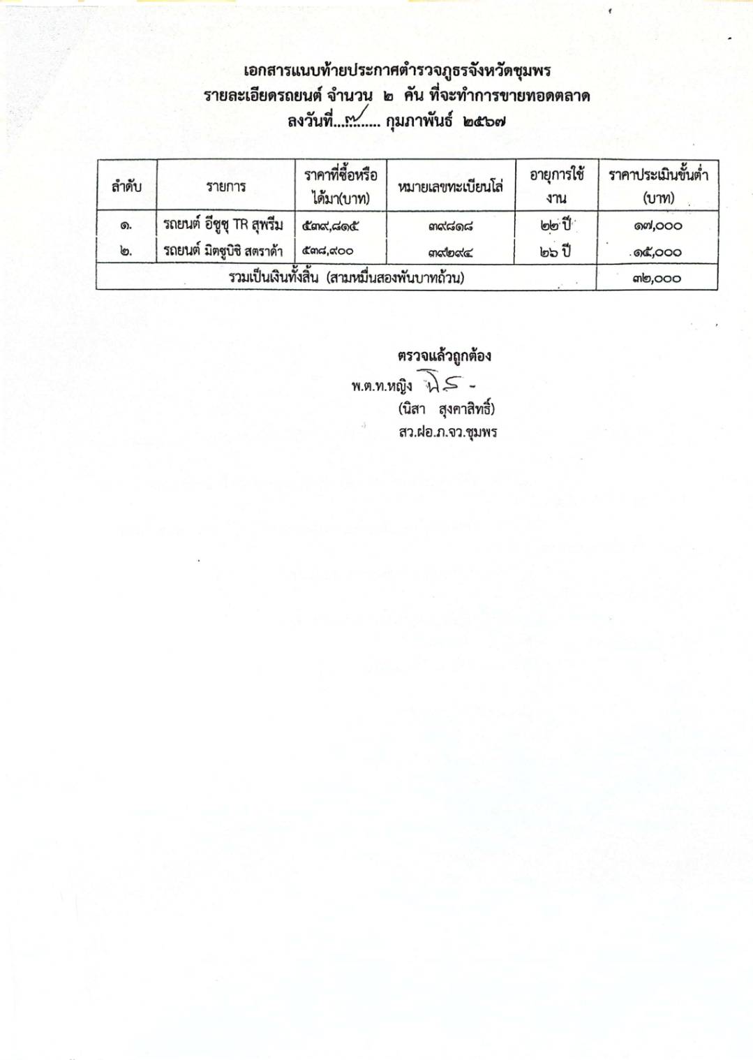 ประกาศขายทอดตลาดครุภัณฑ์ยานพาหนะรถยนต์ 12 กุมภาพันธ์ 2567 by admin / ข่าวประชาสัมพันธ์,ข่าวประชาสัมพันธ์,ข่าวฝากประชาสัมพันธ์,ข่าว ภ.จว.ชุมพร,งานส่งกำลังบำรุง ตำรวจภูธรจังหวัดชุมพร มีความประสงค์จะขายทอดตลาดครุภัณฑ์ยานพาหนะและขนส่งของทางราชการ (รถยนต์) รายละเอียดตามเอกสาร