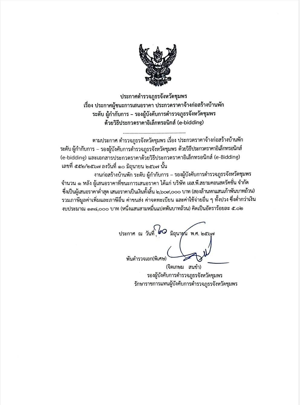 ประกาศผู้ชนะการประกวดราคาจ้างก่อสร้างบ้านพัก ระดับ ผกก.-รอง ผบก.ฯ ภ.จว.ชุมพร 20 มิถุนายน 2567 by admin / ข่าว ภ.จว.ชุมพร,ข่าวประชาสัมพันธ์,ข่าวประชาสัมพันธ์,ข่าวฝากประชาสัมพันธ์,ข่าว ภ.จว.ชุมพร,งานส่งกำลังบำรุง ประกาศผู้ชนะการเสนอราคา ประกวดราคาจ้างก่อสร้างบ้านพัก ระดับ ผกก.-รอง ผบก.ฯ ภ.จว.ชุมพร