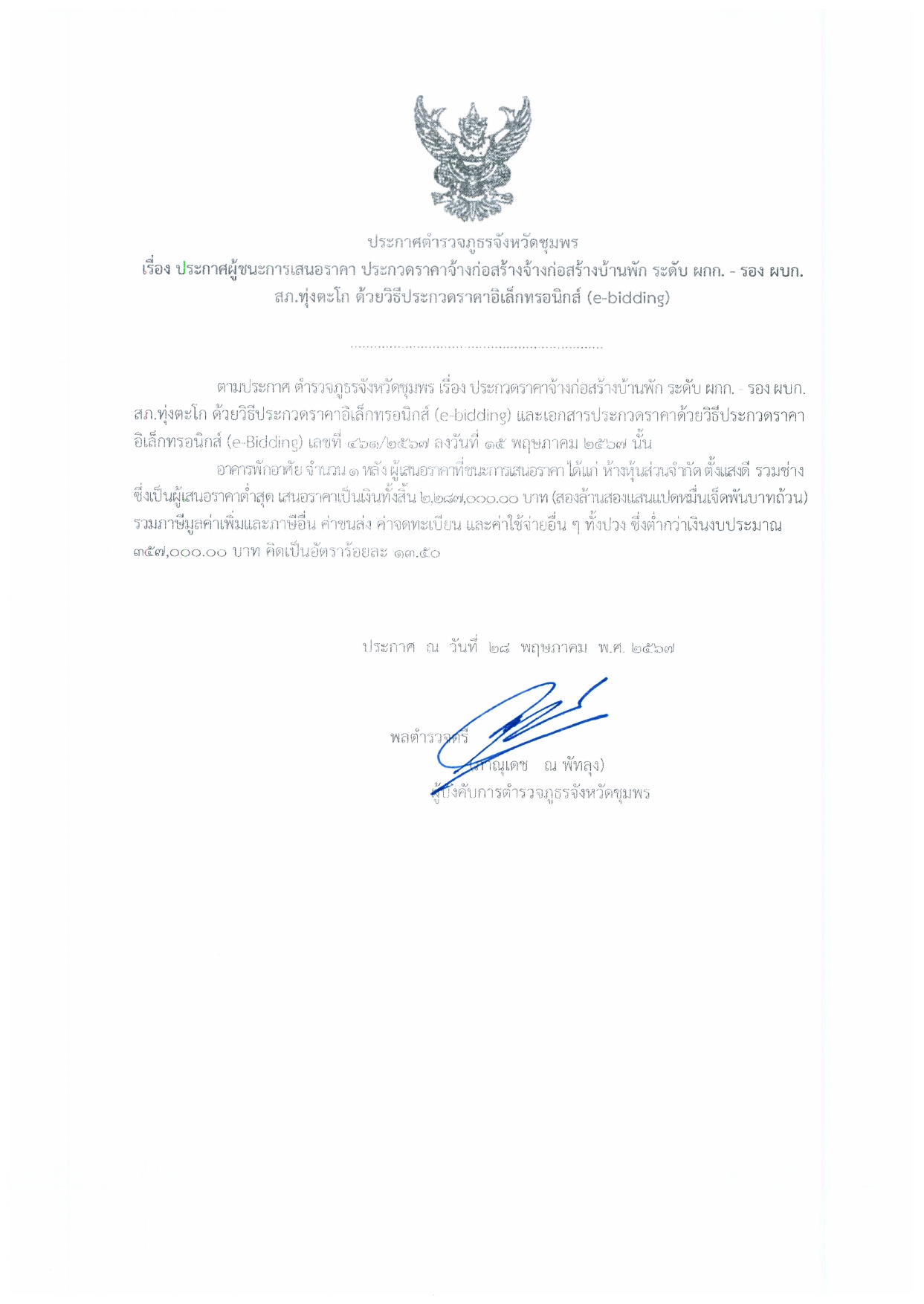 ประกาศผู้ชนะการประกวดราคาจ้างก่อสร้างบ้านพัก สภ.ทุ่งตะโก 28 พฤษภาคม 2567 by admin / ข่าว ภ.จว.ชุมพร,ข่าว ภ.จว.ชุมพร,งานส่งกำลังบำรุง ประกาศผู้ชนะการเสนอราคาจ้างก่อสร้างบ้านพัก ระดับ ผกก.-รอง ผบก.ฯ ของ สภ.ทุ่งตะโก