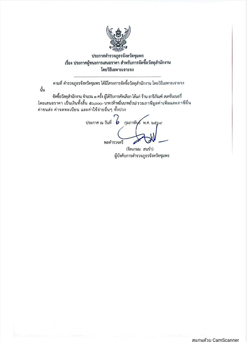 ประกาศผู้ชนะเสนอราคา สำหรับการจัดซื้อวัสดุสำนักงานโดยวิธีเฉพาะเจาะจง 2 กุมภาพันธ์ 2569 by admin / ข่าวประชาสัมพันธ์,ข่าว ภ.จว.ชุมพร,งานส่งกำลังบำรุง