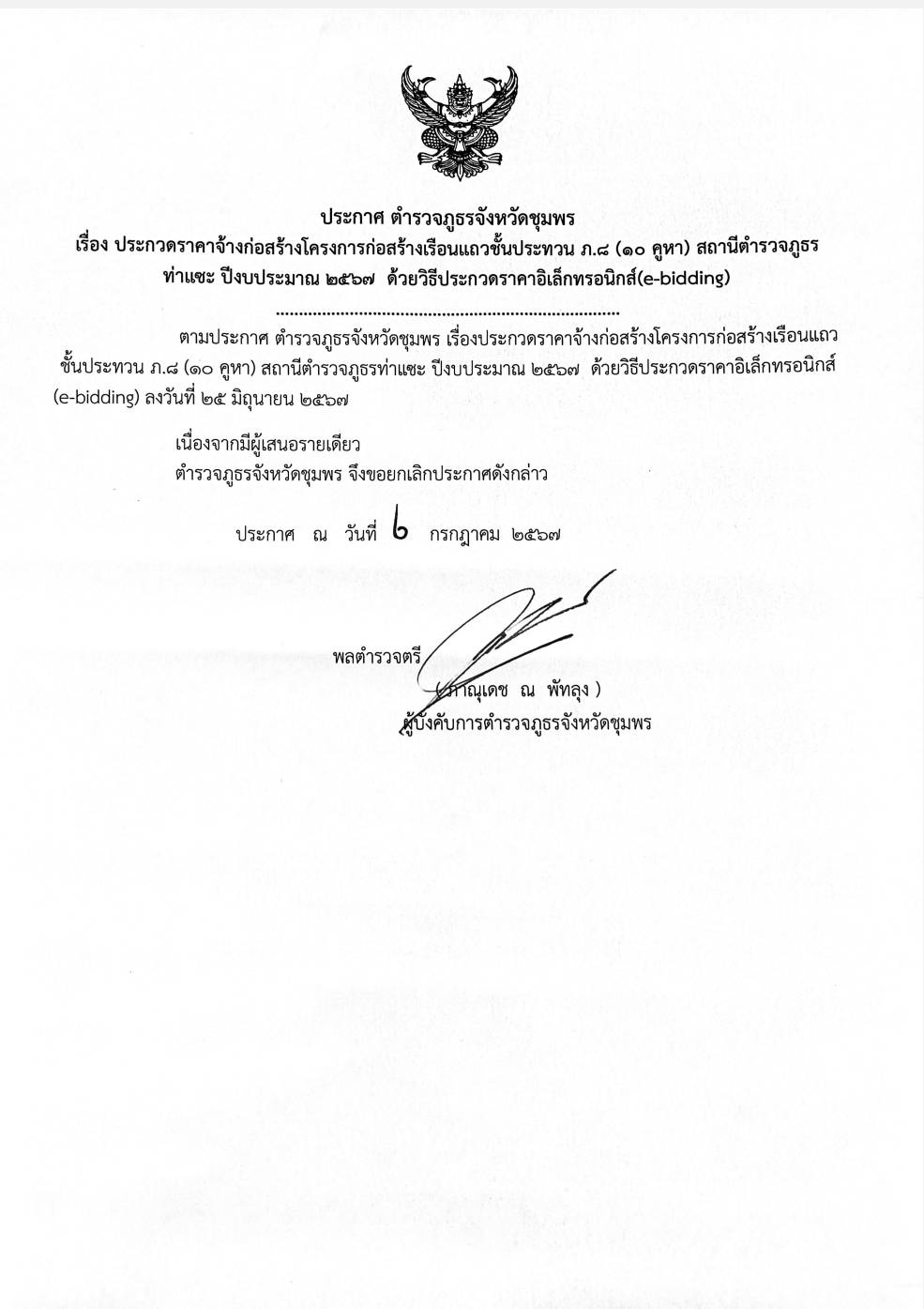 ยกเลิกการประกวดราคา จ้างก่อสร้างเรือนแถวชั้นประทวน สภ.ท่าแซะ 2 กรกฎาคม 2567 by admin / ข่าว ภ.จว.ชุมพร,ข่าวประชาสัมพันธ์,ข่าวประชาสัมพันธ์,ข่าวฝากประชาสัมพันธ์,ข่าว ภ.จว.ชุมพร,งานส่งกำลังบำรุง ยกเลิก การประกวดราคาจ้างก่อสร้าง โครงการก่อสร้างเรือนแถวชั้นประทวน สภ.ท่าแซะ