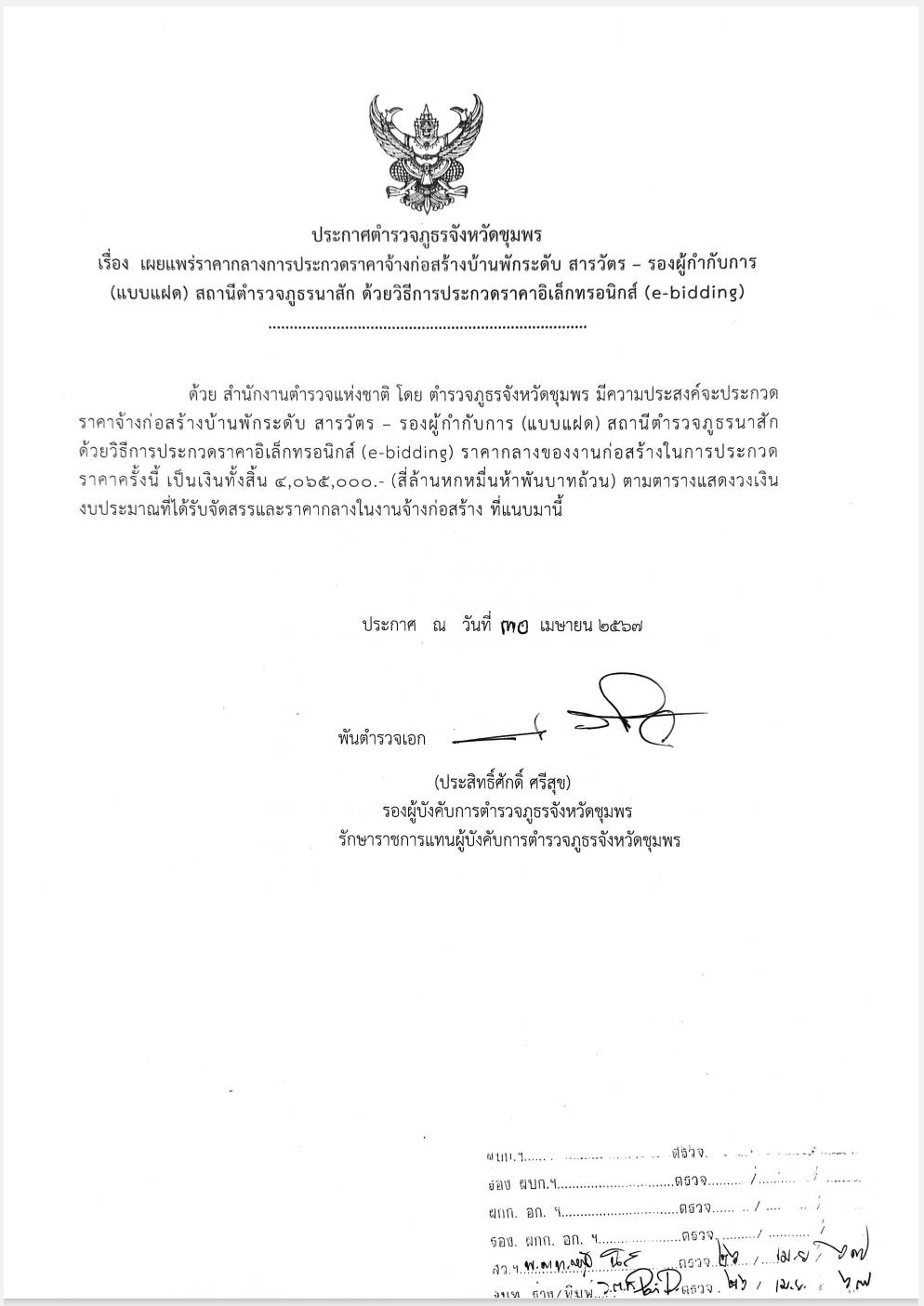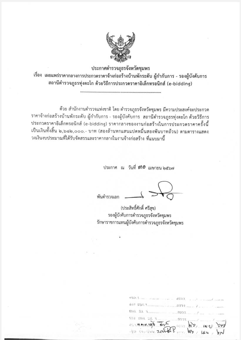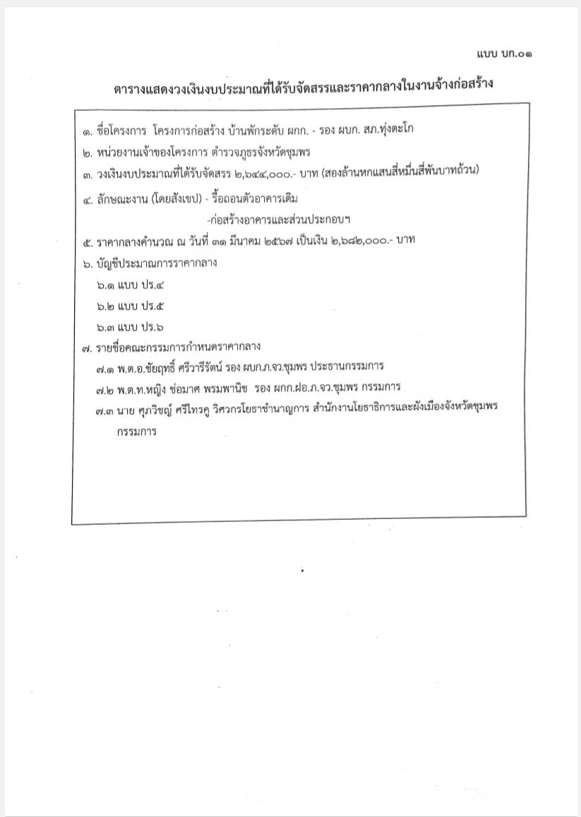 ตำรวจภูธรจังหวัดชุมพร เผยแพร่ราคากลางการประกวดราคาจ้างก่อสร้างบ้านพักระดับ ผู้กำกับการ – รองผู้บังคับการ สถานีตำรวจภูธรทุ่งตะโก และ สถานีตำรวจภูธรนาสัก ด้วยวิธีการประกวดราคาอิเล็กทรอนิกส์