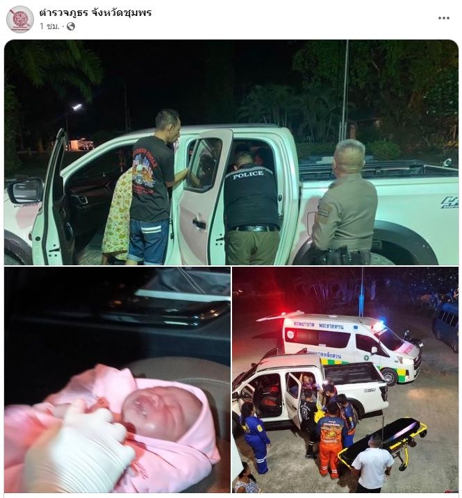 วันที่ 13 ก.ค.66 เวลา 19.30 น. จนท.ตร.สภ.บ้านในหูต ได้รับการประสานจากประชาชนซึ่งมาจากบ้านทับช้างว่า ตนเองได้พาหญิงชาวเมียนมาซึ่งเจ็บท้องกำลังจะคลอดลูกไปหาหมอที่ รพ.หลังสวน แต่ระหว่างอยู่บนรถยนต์ เจ็บท้องอย่างรุนแรงพร้อมกับคลอดลูกบนรถยนต์ ตนเองตกใจทำอะไรไม่ถูก จึงได้ขับรถยนต์เข้ามา สภ.บ้านในหูต และขอความช่วยเหลือ ต่อมาเจ้าหน้าที่ตำรวจ สภ.บ้านในหูต ได้ช่วยเหลือเบื้องต้นจนกระทั้งเด็กได้คลอดออกมาอย่างปลอดภัย ทั้งแม่และลูก เด็กสภาพร่างกายสมบูรณ์ จากนั้นได้รีบประสาน โรงพยาบาลหลังสวนและกู้ภัย รับตัวทั้งแม่และเด็กไปดูแลต่อไป