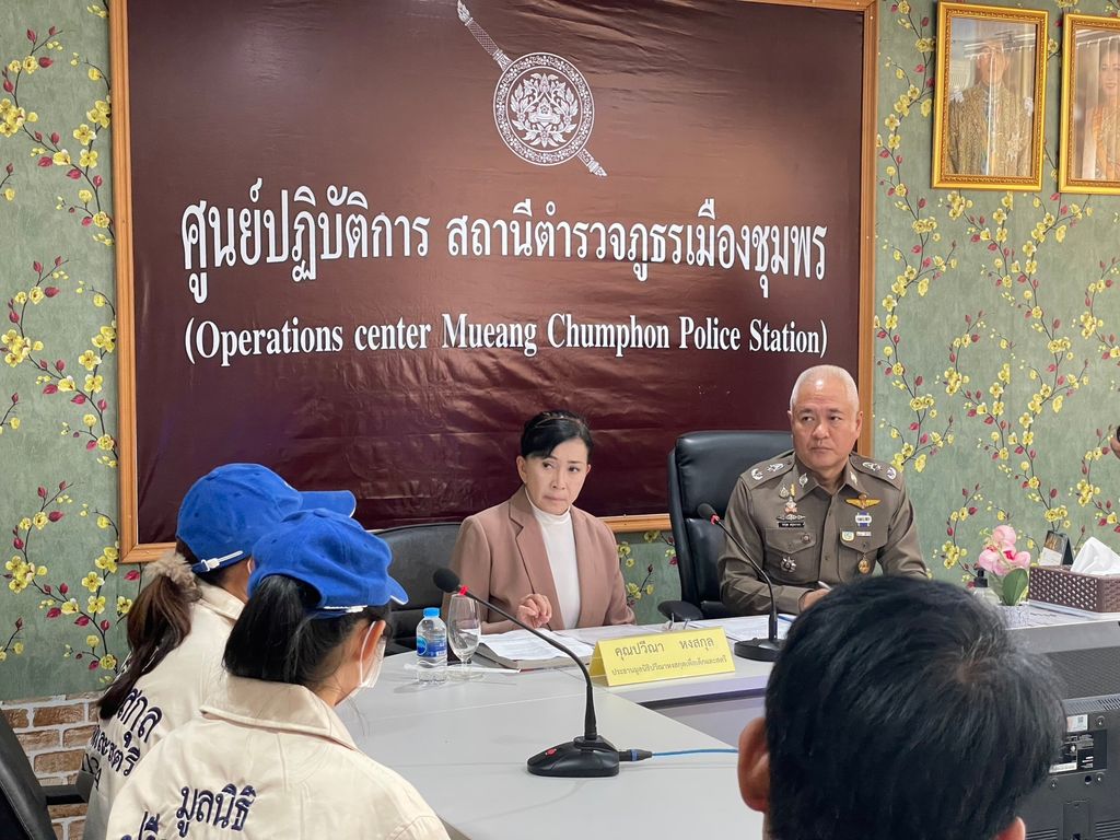 พล.ต.ต.จารุต ศรุตยาพร ผบก.ภ.จว.ชุมพร,นางปวีณา หงสกุล ประธานมูลนิธิปวีณาหงสกุลเพื่อเด็กและสตรี ร่วมประชุมเร่งรัดติดตามคดีเกี่ยวกับการเสียชีวิตของ นางเอิบอร วานิชย์ตระกูล